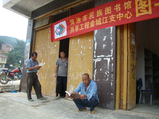 市民族图书馆在深化这一系列服务活动的同时,还对乡镇文化站、村文化室,校园文化,如何优势互补,相辅相成。活动相互联动,争取文化覆盖最大化的一系列服务活动大胆尝试,对于象该乡纳六等村,设施较完善的文化室进行图书注入,给他们送来图书1000册,书架10个,阅览桌3张,阅览椅12张,并且在图书业务上给予指导,帮助建章立制,强化管理,进行村、站、学校图书外借,资源利用。现在该乡,村、站,校园、民间文化网络覆盖正在形成。
