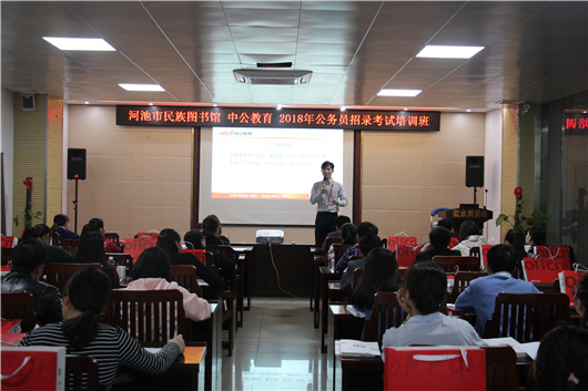 为了服务更多的年轻人,特别是帮助西部计划志愿者、三支一扶、大学生村官、特岗教师等基层项目人员顺利通过考试,河池市民族图书馆携手“中公教育”公务员考试培训机构,在本馆内举办公务员、事业单位考试公益培训活动。培训时间为3月31日至4月1日,共计两天,有来自金城江、罗城、环江、宜州等地40多名学员参加。这次公益培训活动为每位考生进行一对一个性化答疑,并现场赠送学习资料。