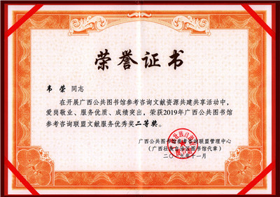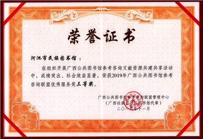 2019年11月20日,广西壮族自治区图书馆参考咨询联盟管理中心为激励先进、树立典型、更好的推进全区参考咨询联盟工作,根据2019年度“图书馆联合参考咨询与远程文献传递平台”的业务统计结果并综合各方面表现,在全区加盟的20家公共图书馆中评选优秀单位和个人,我馆荣获“2019年广西公共图书馆参考咨询联盟优秀服务奖”三等奖,我馆参考咨询员韦荣、韦秋莉分别获得“2019年广西公共图书馆参考咨询联盟文献服务优秀奖”二等奖、三等奖。
