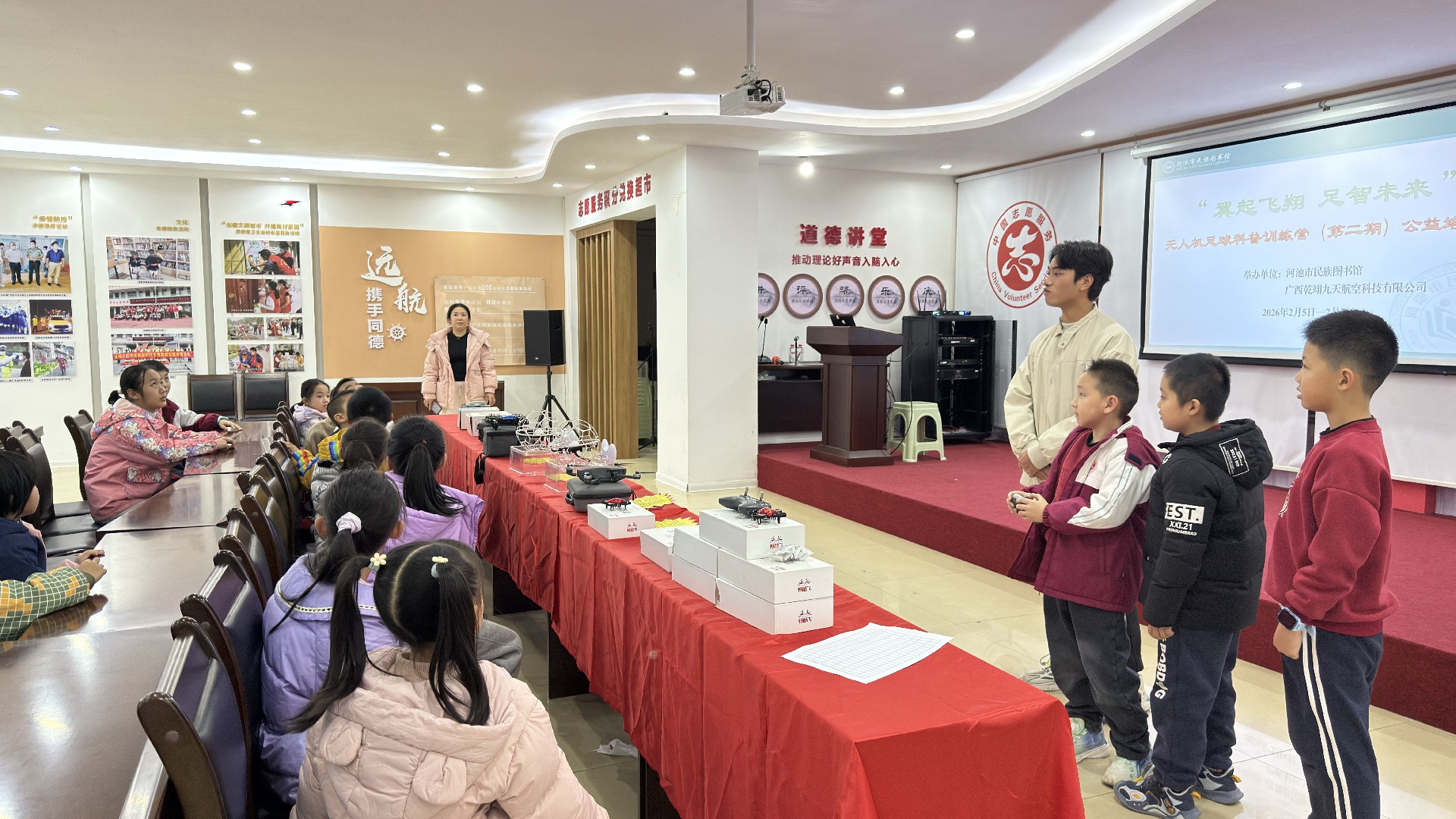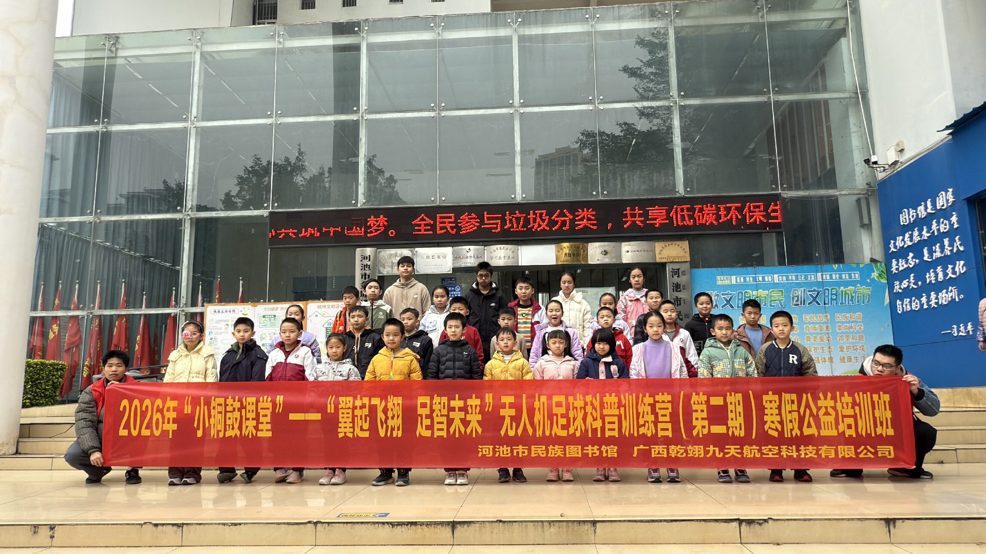 为丰富青少年假期生活,点燃科学探索的热情,2月5日至9日,河池市民族图书馆联合广西乾翊九天航空科技有限公司,在我馆一楼新时代文明实践中心及户外广场,举办2026年“小铜鼓课堂”——“翼起飞翔 足智未来 ” 无人机足球科普训练营(第二期)寒假公益培训班,通过理论讲解、实操训练与赛事体验,让青少年掌握无人机基础操控技能,了解航空运动与国防科技知识,培养团队协作与创新思维,让50多名孩子在趣味实践中玩转科技,度过一个快乐而有意义的假期!