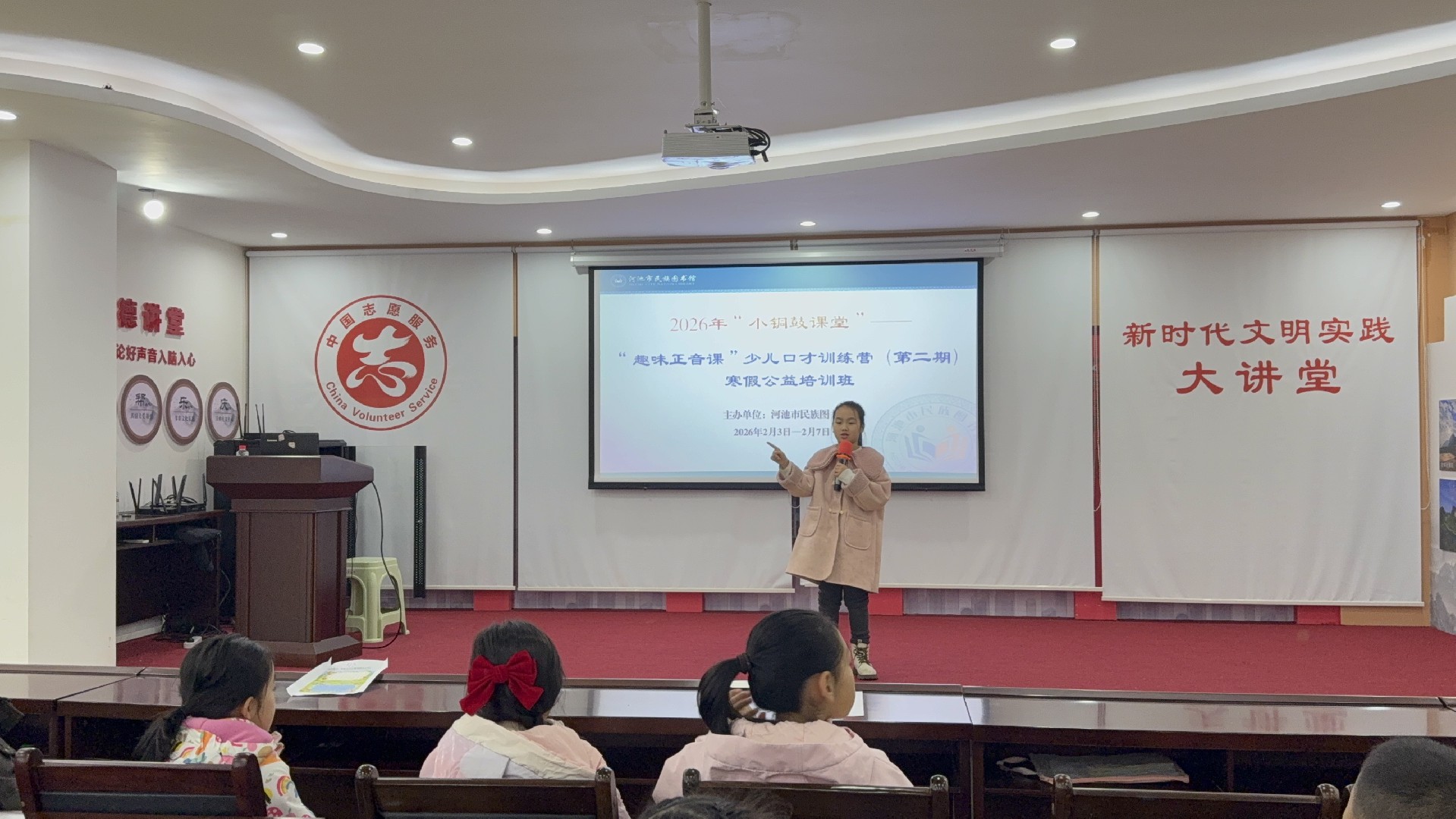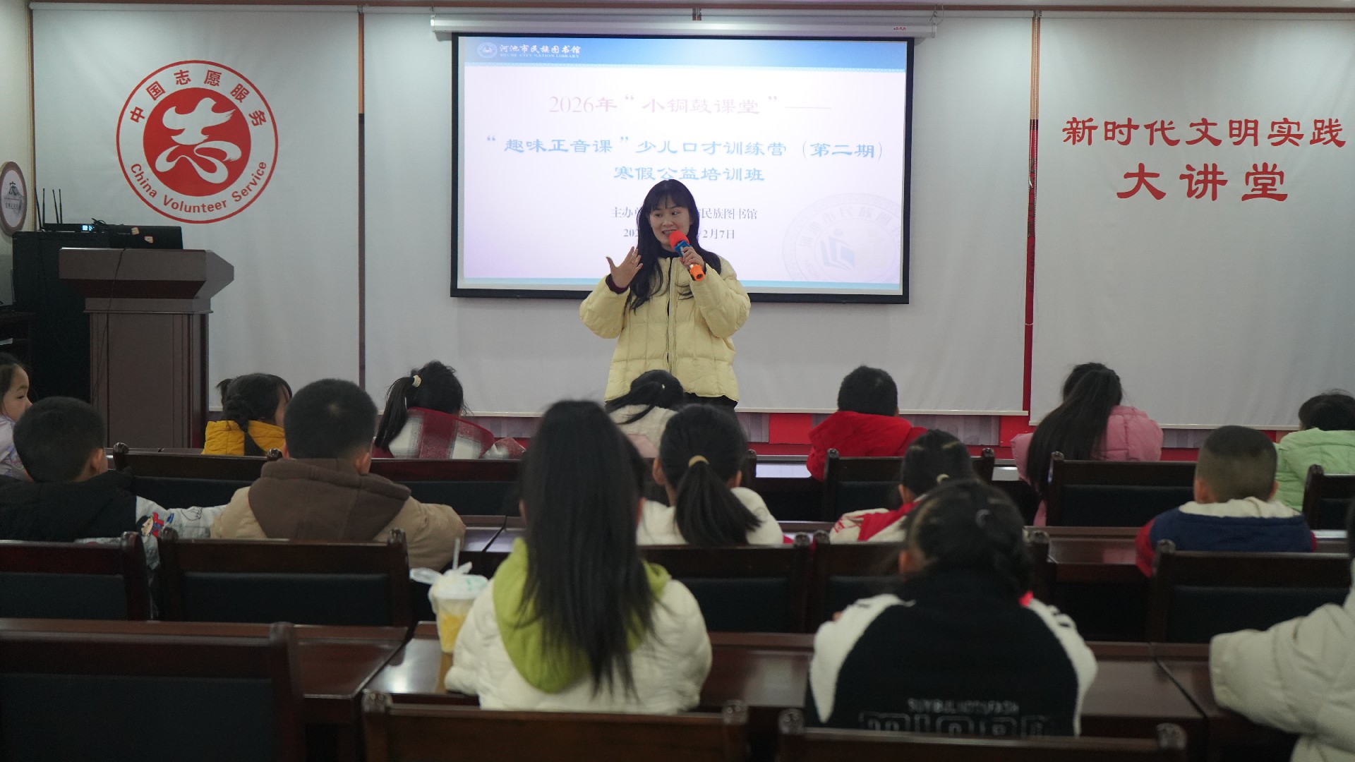 2026年2月3日至7日,河池市民族图书馆2026年“小铜鼓课堂”——“趣味正音课”少儿口才训练营(第二期)寒假公益培训班在馆内一楼新时代文明实践中心顺利开展并圆满结课。本次公益培训班由河池市民族图书馆主办,邀请专业教师授课,30多名小读者在充满趣味的课堂中学习表达、收获成长,共同度过了一段充实而有意义的寒假时光。