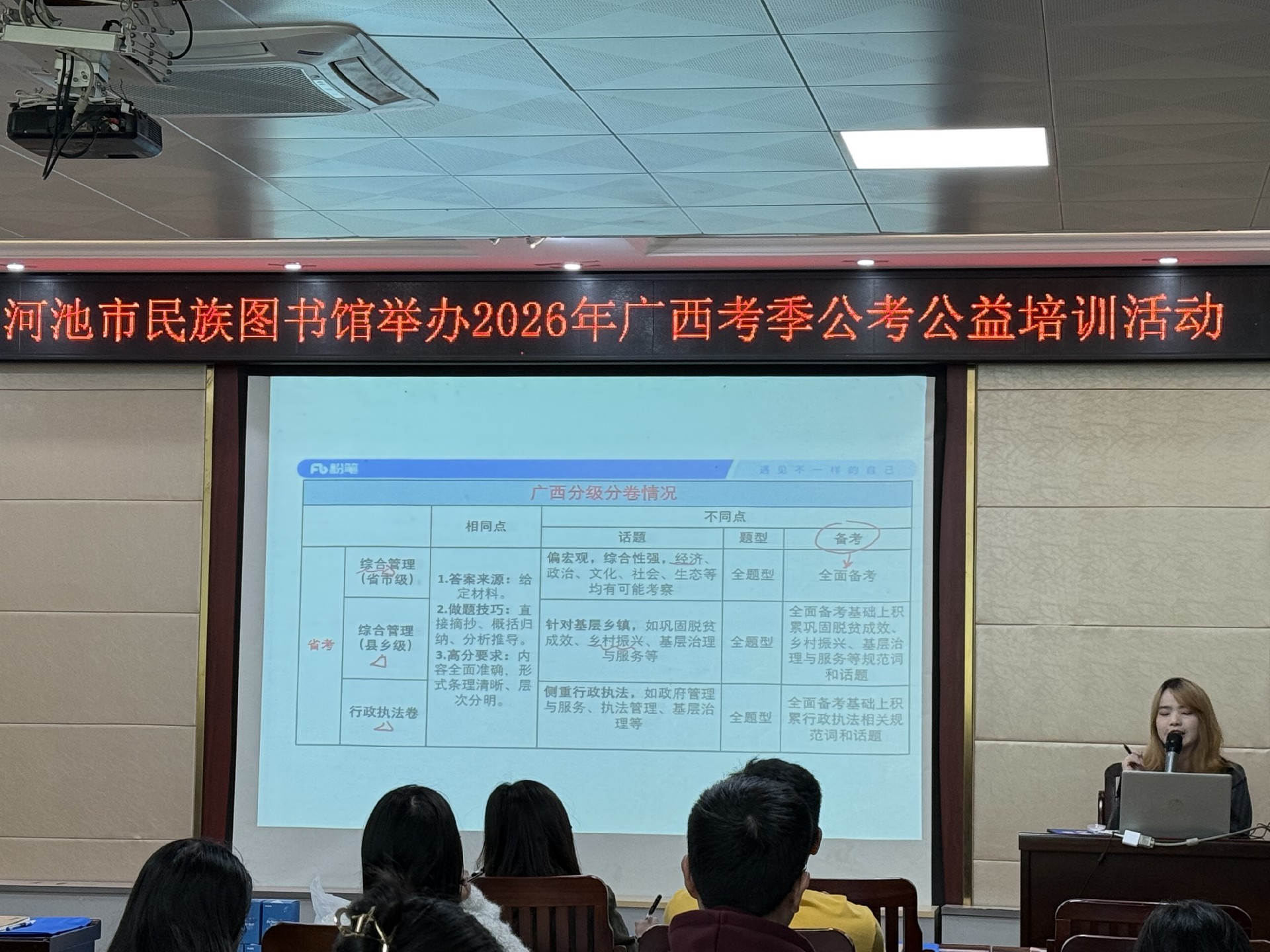 2025年11月23日下午,我馆与河池粉笔教育联合举办的“2026年广西考季公考公益培训”活动,在本馆二楼多功能会议室顺利开展。本次活动旨在帮助我市广大考生明确备考方向、掌握核心要点、增强应试能力,搭建专业便捷的学习交流平台,为青年成长发展助力。活动吸引了我市备战2026年公职类考试的20余位青年考生积极参与。