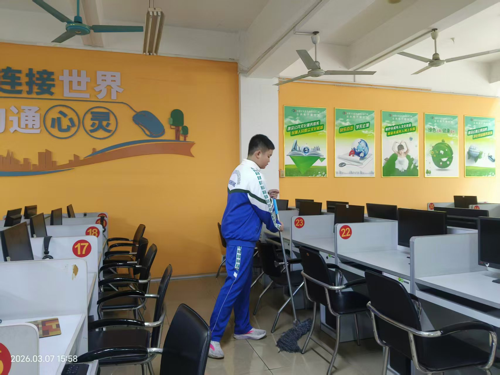 一部分同学化身“清洁小卫士”,拿着扫帚、抹布、拖把等清洁工具,对图书馆的阅览区、书架间隙、走廊过道等区域进行全面细致的清扫。大家认真擦拭书架、桌椅、窗台的灰尘,清理地面垃圾与死角杂物,不放过任何一处卫生盲区,让图书馆的整体环境焕然一新,为读者打造了干净舒适的阅读空间。